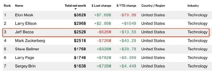 根据美国彭博新闻社亿万富豪指数,贝索斯以大约2400亿美元的财产净值排名第三。前两名分别是身家3630亿美元的特斯拉创始人埃隆·马斯克和拥有2600亿美元财富的“元”公司首席执行官马克·扎克伯格。
