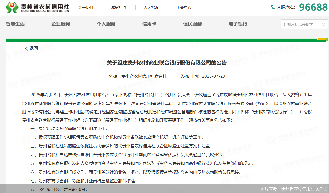 据贵州省农村信用社联合社官网披露,该省联社已于7月28日召开社员大会,审议通过取消法人资格、组建贵州农商联合银行的议案。根据规划,贵州农商联合银行将全面承接原省联社的业务、资产及债权债务,目前其筹建与开业正尚待金融监管部门核准。