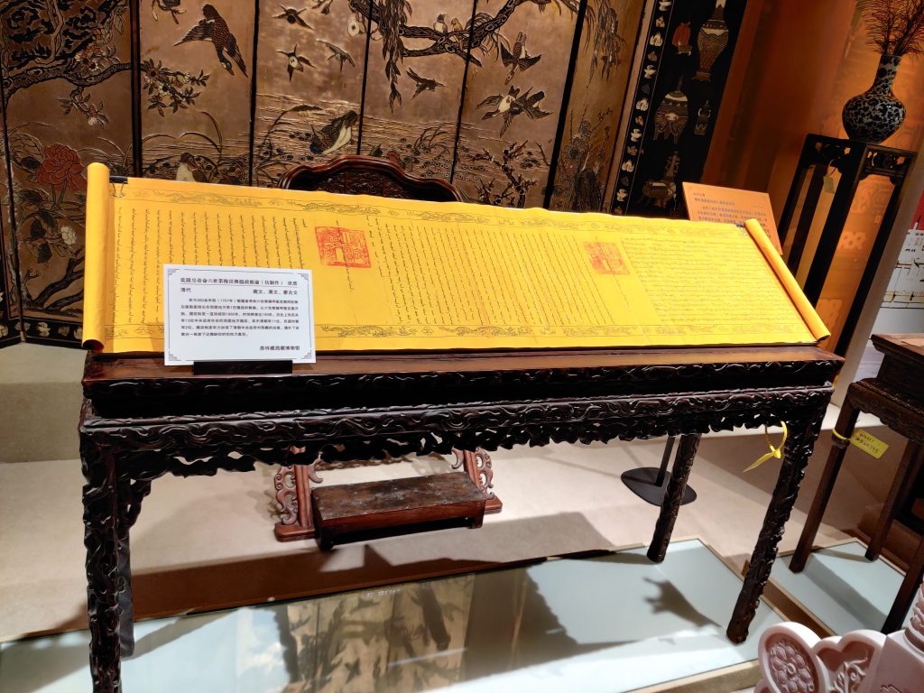 其中,“西藏专展”以明清中央政府治理西藏为主线,以民族文化宫藏的近70件明清宫廷家具和明清中央政府颁赐西藏地方政教首领的37件圣旨、13件印章,讲述西藏与内地各民族交往交流交融和中华民族共同体故事,通过“天下一统”等六个单元系统梳理了从新石器时代至新时代西藏与中原的血脉联系。展览结合西藏民主改革前后的物证图片对比,实证中央对西藏的持续管辖。