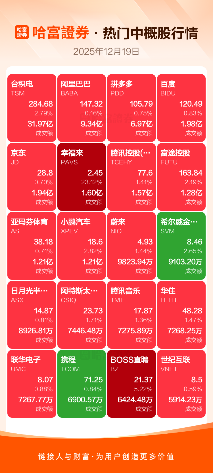 台积电涨2.79%,阿里巴巴涨0.16%,拼多多涨0.75%,百度涨0.83%,京东涨0.70%,幸福来涨23.12%,腾讯控股(ADR)涨1.41%,富途控股涨2.19%,亚玛芬体育涨0.71%,小鹏汽车涨2.82%。