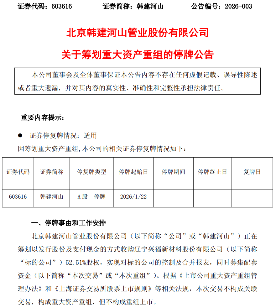 1月21日晚间,韩建河山(603616)披露《关于筹划重大资产重组的停牌公告》称,公司正在筹划以发行股份及支付现金的方式收购辽宁兴福新材料股份有限公司(简称“兴福新材”)52.51%股权,实现对标的公司的控制及合并报表,同时募集配套资金。本次交易不构成关联交易,构成重大资产重组,但不构成重组上市。