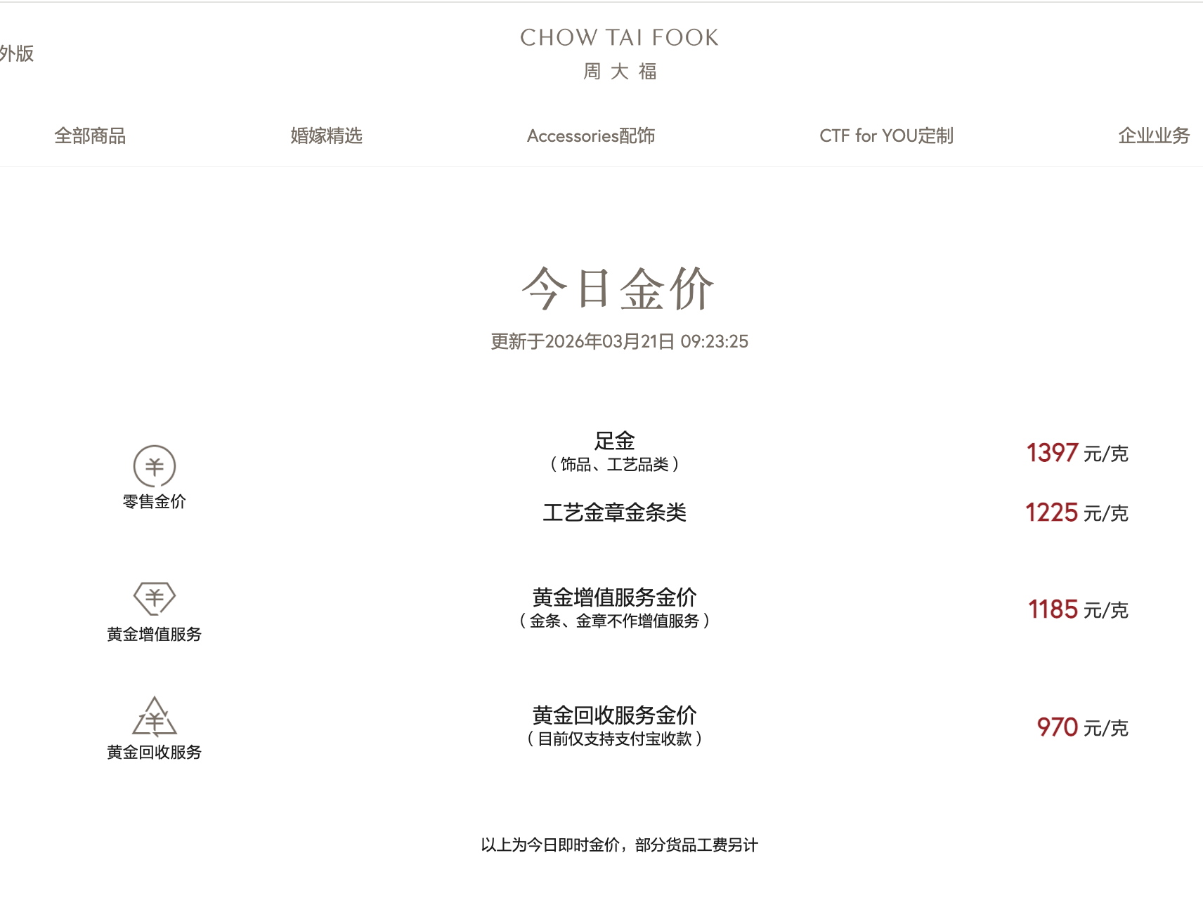周大福的金饰价格从1447元/克回落至1397元/克,单日下跌50元。