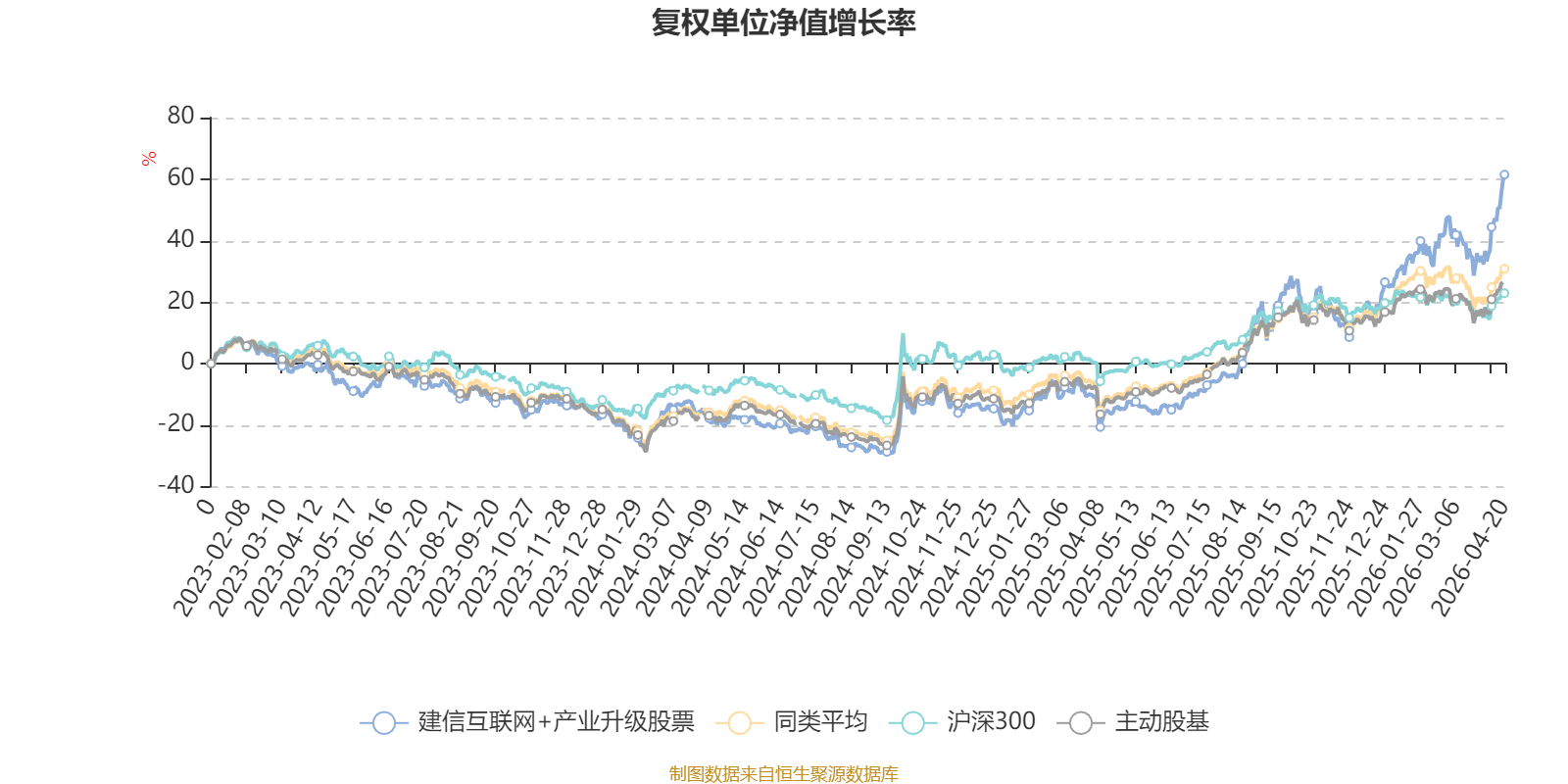 截至4月20日,建信互联网+产业升级股票近三个月复权单位净值增长率为21.69%,位于同类可比基金4/167;近半年复权单位净值增长率为41.37%,位于同类可比基金6/167;近一年复权单位净值增长率为91.77%,位于同类可比基金13/166;近三年复权单位净值增长率为60.32%,位于同类可比基金21/157。